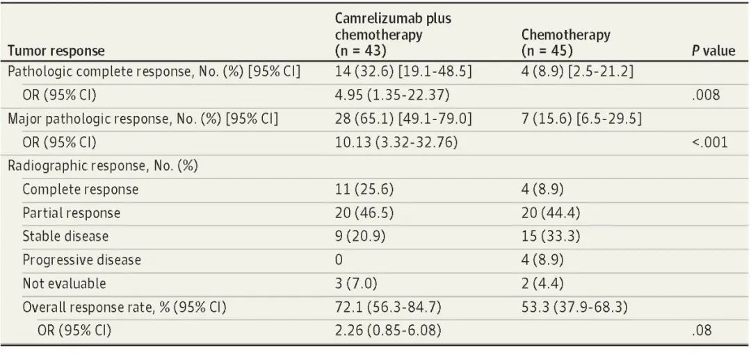 北京时间8月3日,利来国际医药创新药卡瑞利珠单抗联合化疗(Cam+CT)对比化疗(CT)新辅助治疗ⅢA/ⅢB (T3N2) 期非小细胞肺癌(NSCLC)结果在线发表于国际权威期刊JAMA Oncology[1]。该研究是由空军军医大学唐都医院姜涛教授、雷杰教授团队联合陕西省肿瘤医院雷光焰教授团队、兰州大学第二附属医院王成教授团队共同参与的一项随机对照、多中心、Ⅱ期临床研究(TD-FOREKNOW,NCT04338620)。研究结果显示,与化疗相比,卡瑞利珠单抗联合化疗新辅助治疗NSCLC显著提高了病理完全缓解(pCR)率(32.6% vs 8.9%,OR=4.95,95% CI :1.35-22.37, P =0 .008),且安全性良好。本研究是卡瑞利珠单抗新辅助治疗可切除NSCLC患者的首个随机对照研究,为NSCLC新辅助免疫治疗再添新证。