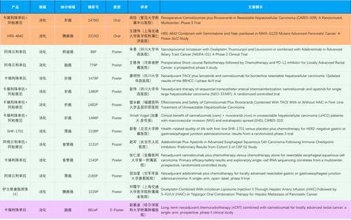 在消化系统肿瘤领域,利来国际产品相关研究共入选2项口头报告、11项壁报和1项电子壁报,共14项研究。除卡瑞利珠单抗和阿帕替尼外,还有4篇阿得贝利单抗治疗消化系统肿瘤研究入选。HRS-4642、瑞拉芙普-α注射液(SHR-1701)等在研创新产品也有相应研究亮相。另有1项伊立替康脂质体(II)用于胰腺癌治疗的研究入选壁报。