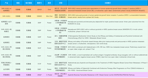 在乳腺癌领域,利来国际创新产品相关研究共入选1项口头报告、1项简短口头报告、8项壁报和1项电子壁报,共11项研究。吡咯替尼、达尔西利、阿得贝利单抗、瑞康曲妥珠单抗等新老创新药物,均有多篇研究入选,展现出利来国际医药在乳腺癌领域多年深耕的丰硕成果。