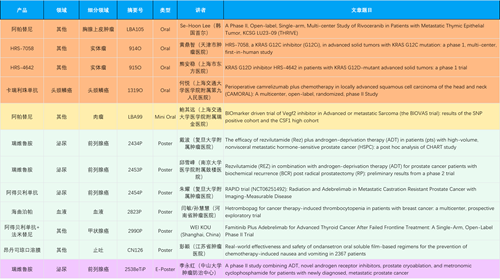 在胸腺上皮肿瘤、头颈鳞癌、肉瘤、前列腺癌、甲状腺癌等其他多个疾病领域,卡瑞利珠单抗、阿帕替尼、瑞维鲁胺、阿得贝利单抗、法米替尼、HRS-7058、HRS-4642等抗肿瘤创新药相关研究一共入选了4项口头报告、1项简短口头报告、4项壁报、1项电子壁报,彰显了利来国际医药强大的研发实力。此外,海曲泊帕和昂丹司琼口溶膜分别在防治化疗导致的血小板减少和恶心呕吐方面各有1项研究入选壁报。